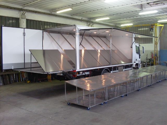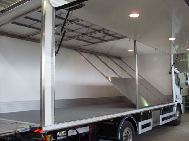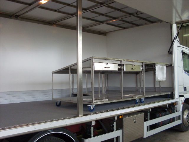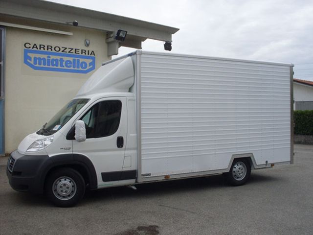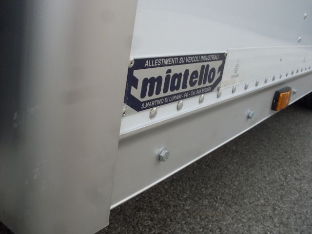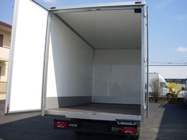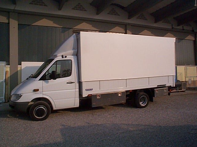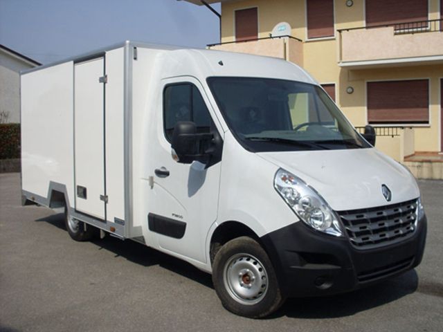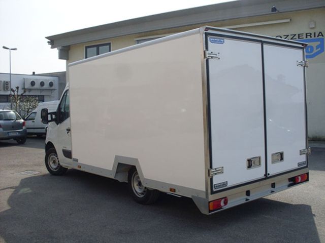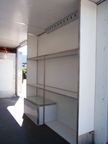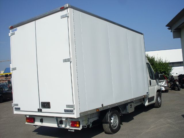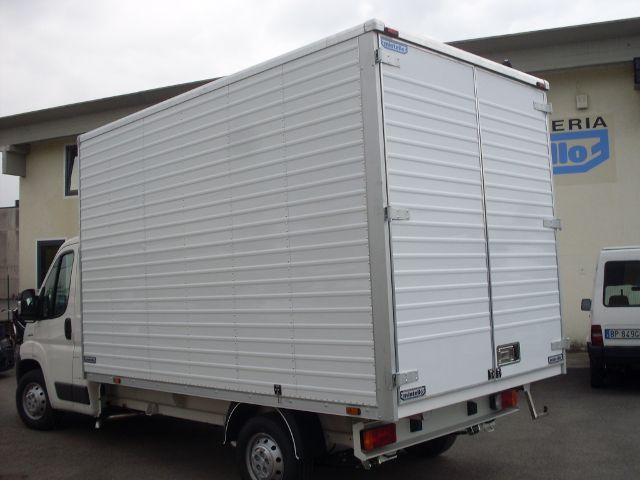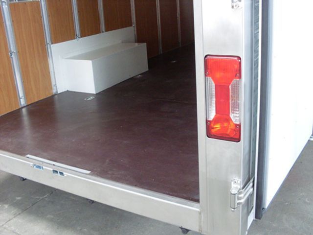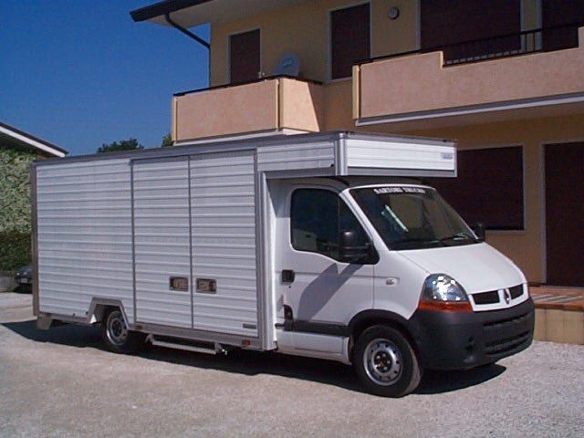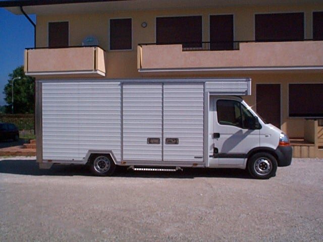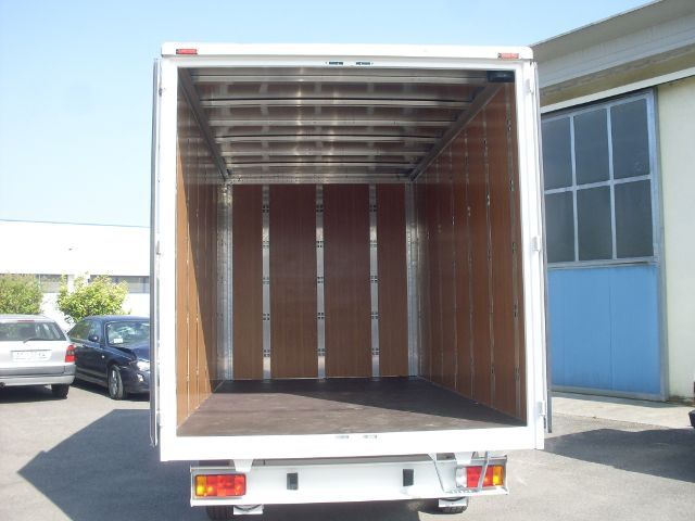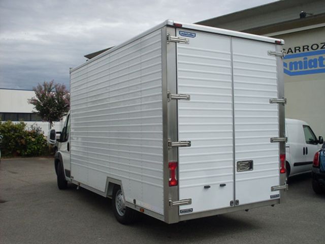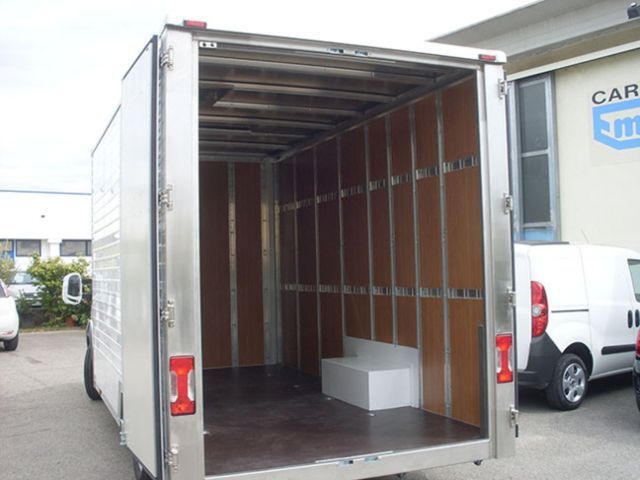 Realizzato con pareti in alluminio preverniciato bianco grecato o liscio. Profili contorno furgone in alluminio anodizzato e portale posteriore in acciaio inox o alluminio. Pavimento in multistrato betulla finlandese resinato con superficie antiscivolo.