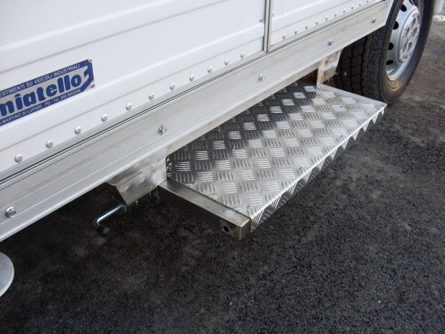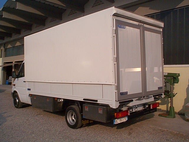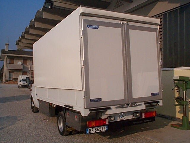 Coppia porte posteriori a due battenti con chiusure incassate od esterne inox. Cassetto porta attrezzi e coppia parafanghi