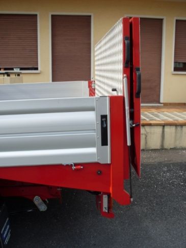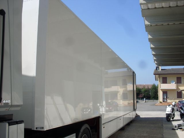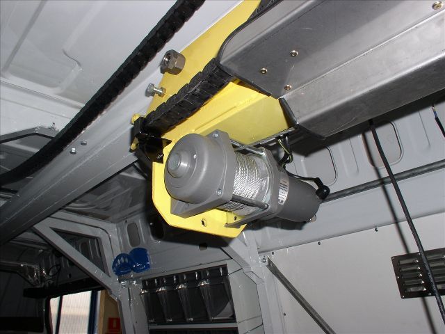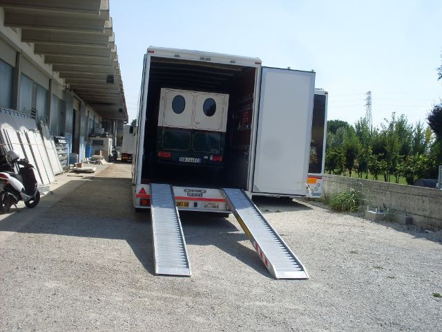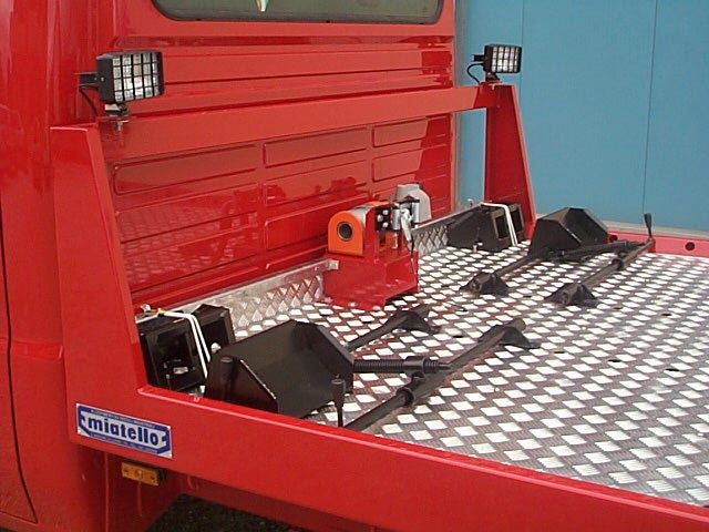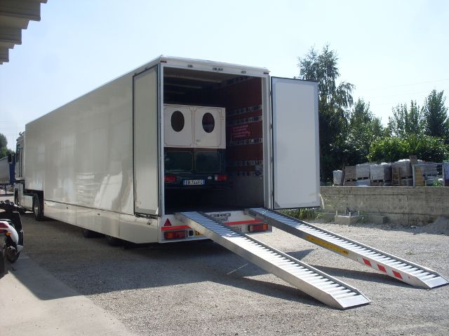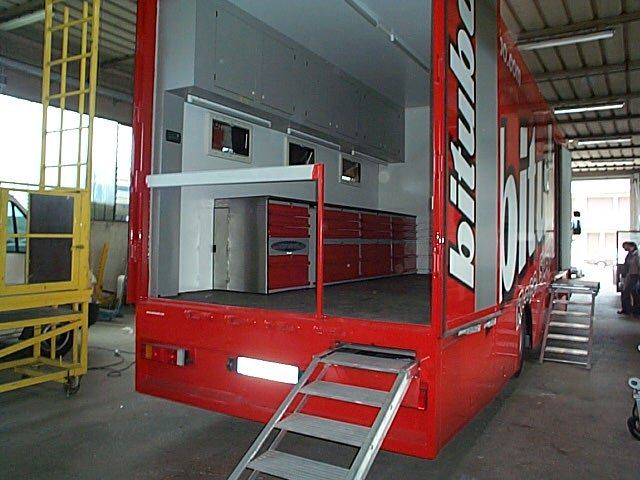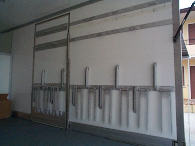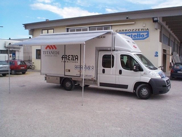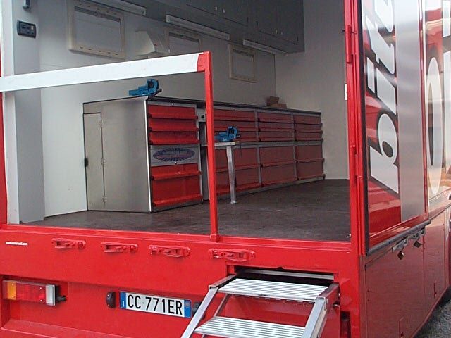 Allestimento officina mobile di pronto intervento con serie di vani modulari laterali dotati di chiusure a serranda in alluminio, dedicati all'alloggiamento di atrezzature, ricambi e materiali di consumo anche infiammabili.
