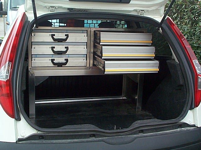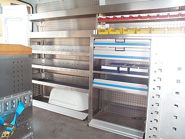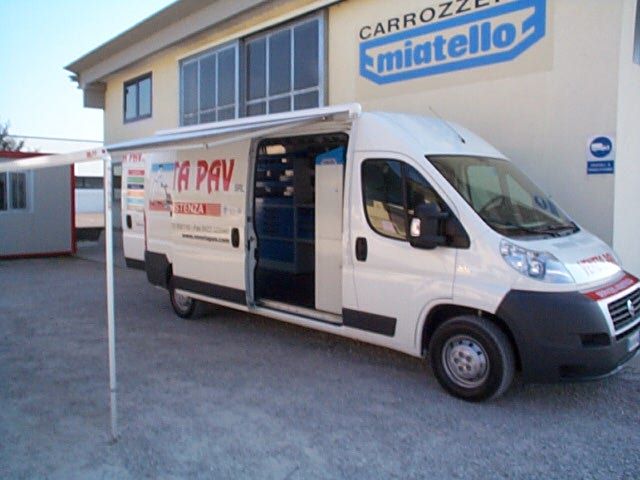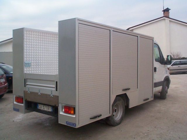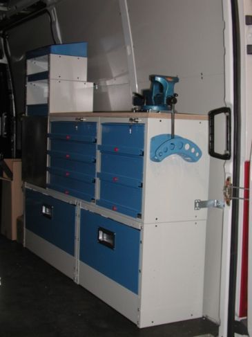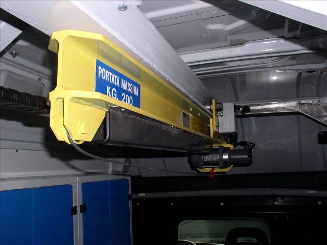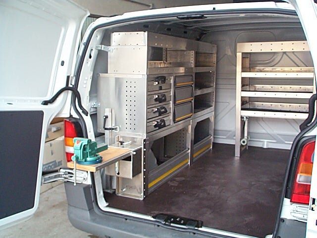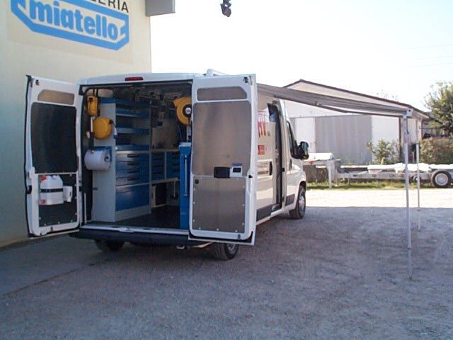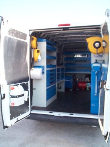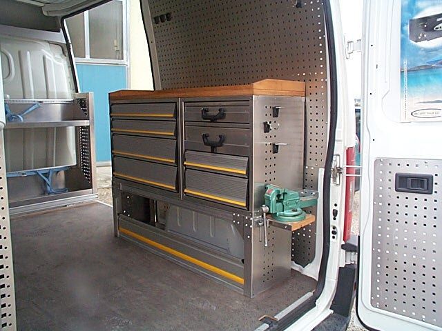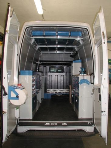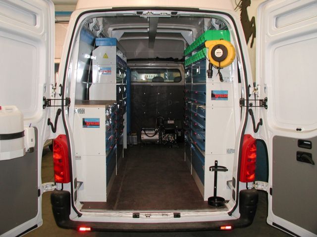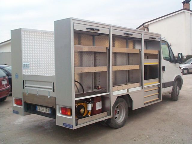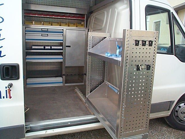 Il furgone è dotato di scaffalature modulari collocate internamente, banco di lavoro con attrezzature dedicate, vani con eventuale chiusura a serranda in alluminio e cassetti porta attrezzi.